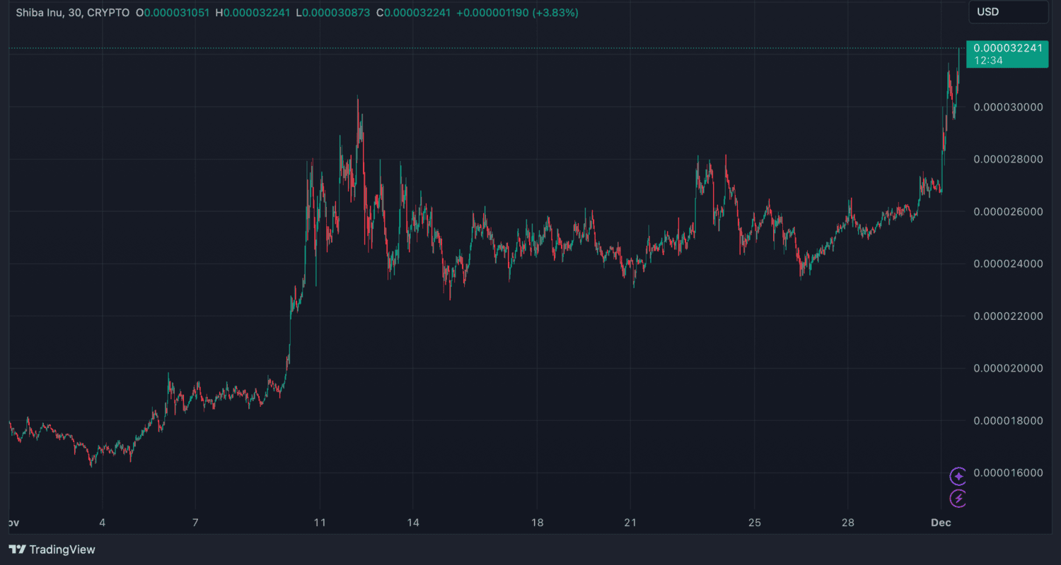 Minulý mesiac cena Shiba Inu (SHIB) vzrástla o 35 %, čo ukazuje rastúci záujem investorov a dôveru v budúcnosť Shiba Inu.