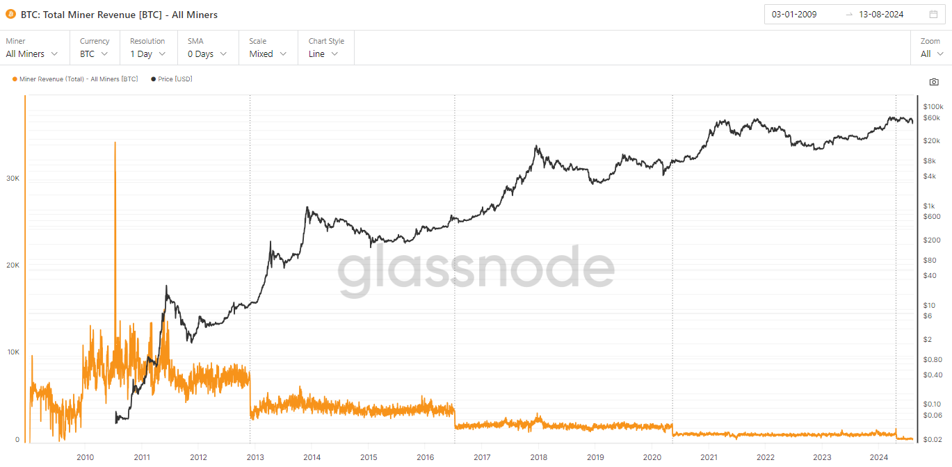 Klesajúce výnosy ťažiarov. Zdroj: Glassnode