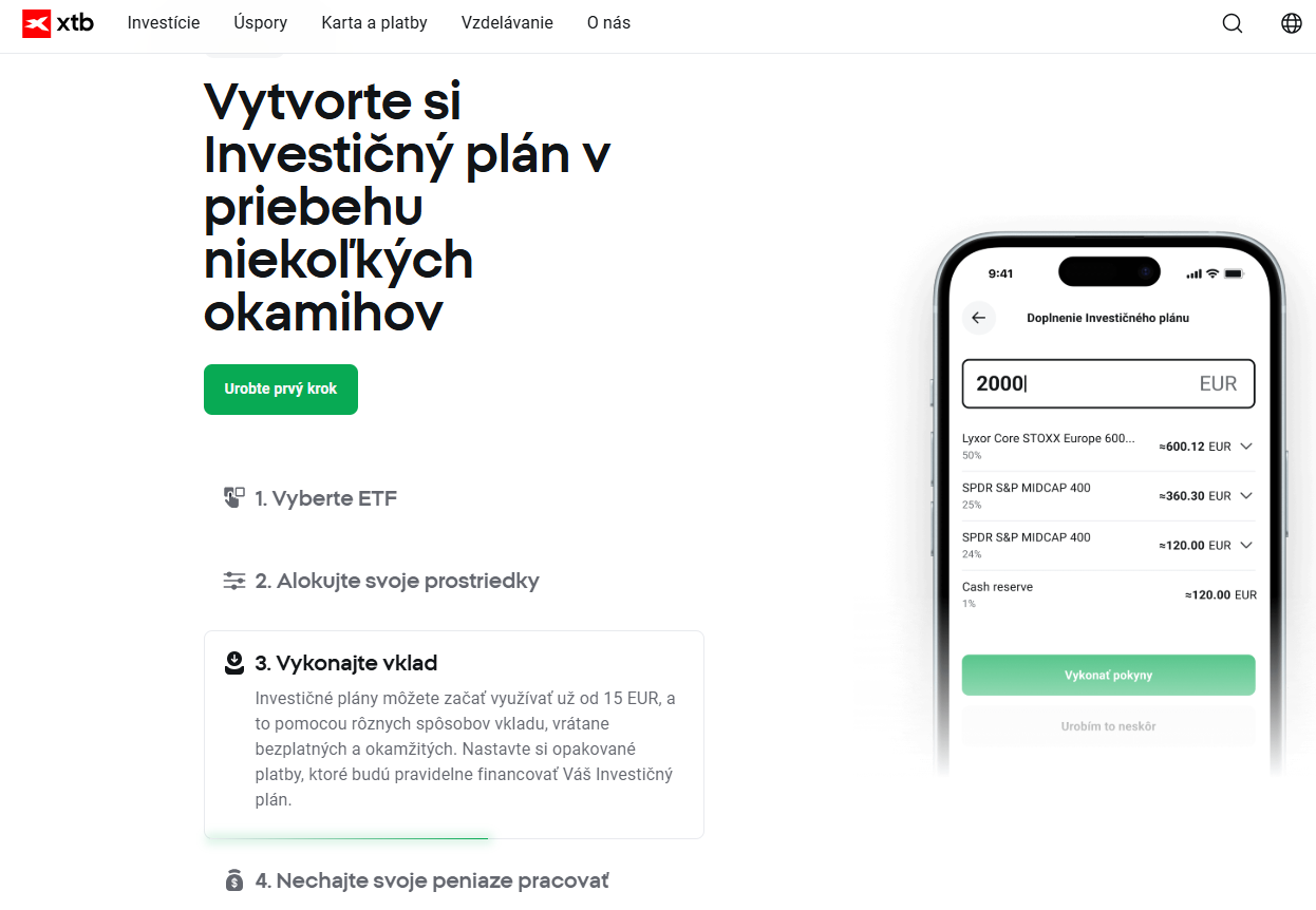 Investičné plány od XTB vám umožňujú systematicky budovať kapitál pravidelnými vkladmi do akcií a ETF. Platforma ponúka možnosť nastaviť si mesačné sumy podľa vlastných cieľov a rizikového profilu, pričom všetko prebieha bez poplatkov až do 100 000 eur mesačne.