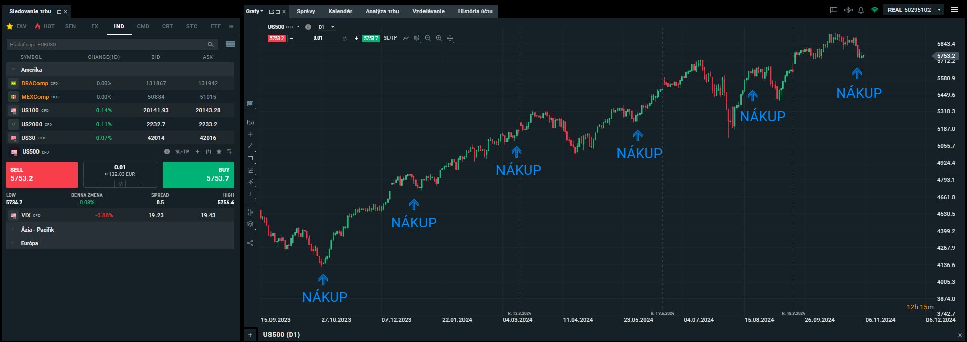 Investori pri stratégii DCA väčšinou uprednostňujú akciové indexy ako napríklad americký S&P 500, ktorý sleduje 500 najväčších firiem v USA. Na XTB si viete šetriť na dôchodok touto cestou. Konkrétne S&P 500 nájdete pod skratkou US500, ako môžete vidieť na obrázku nižšie.