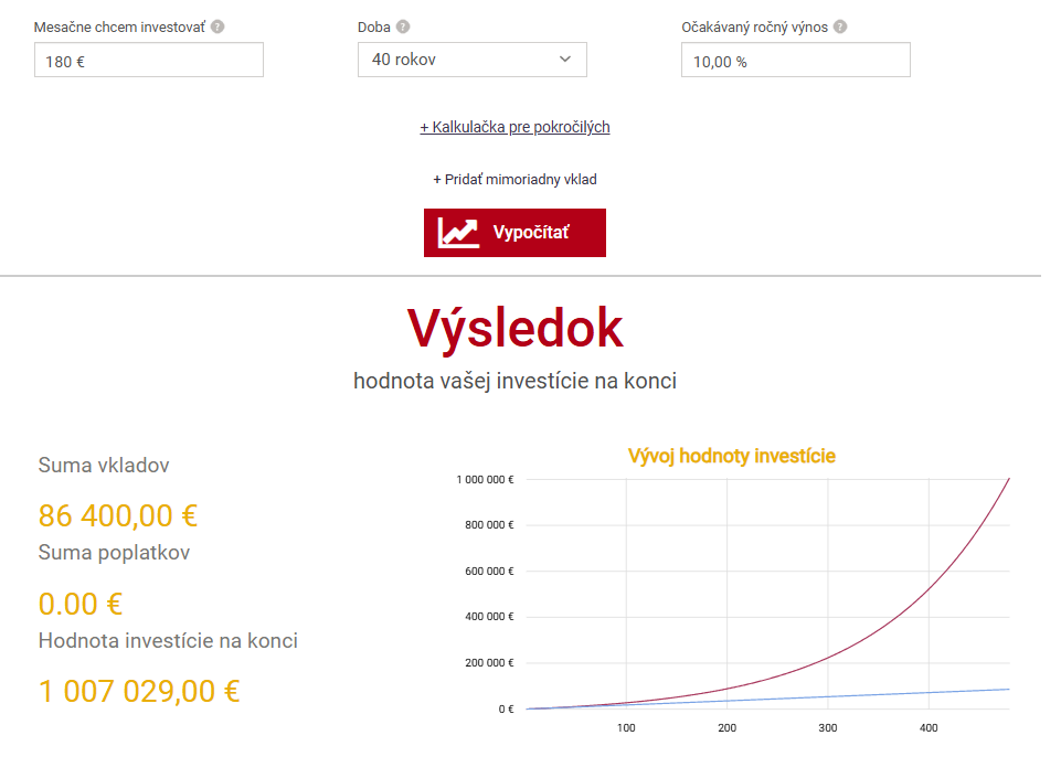Teraz je na čase odpovedať si na otázku ako zo 6 eur denne urobiť 1 milión eur. A obrázok nižšie je odpoveďou na túto otázku. Ak by ste denne odložili 6 eur a mesačne investovali 180 eur (6*30 dní), tak za 40 rokov a pri ročnom zhodnotení 10 % by ste získali 1 milión eur.