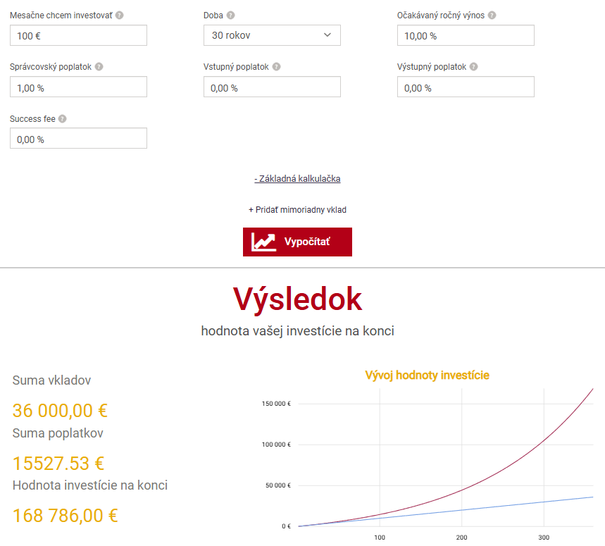 Ak pravidelne investujete 100 eur mesačne pri ročnom výnose 10 % po dobu 30 rokov, s rôznymi poplatkami sa výsledná suma môže výrazne líšiť: