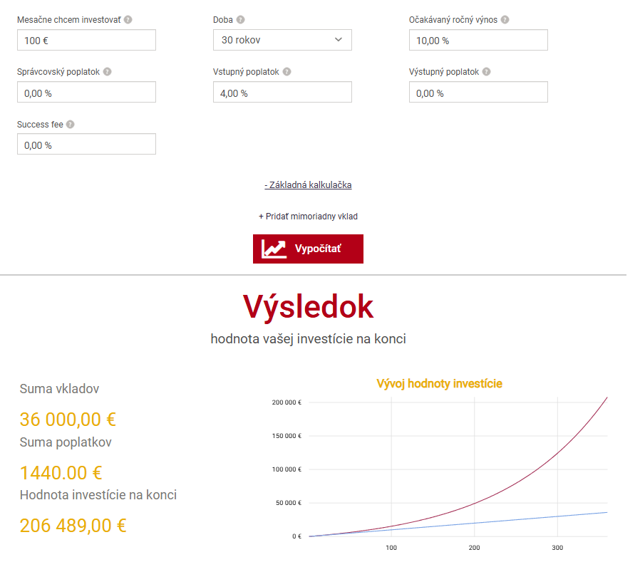 - Príklad so vstupným poplatkom: Vstupný poplatok 4 % z koncovej sumy (100 * 12 * 30 = 36 000 eur) znamená, že zaplatíte 1 440 eur. Tento poplatok môžete zaplatiť ihneď, ale aj postupne v splátkach. Ak ho zaplatíte ihneď, všetky vklady sa hneď zhodnocujú v investovaní. Ak je vám však veľa zaplatiť celý poplatok naraz, môžete ho splácať aj 3 roky. Na konci obdobia budete mať ma účte 206 489 eur.