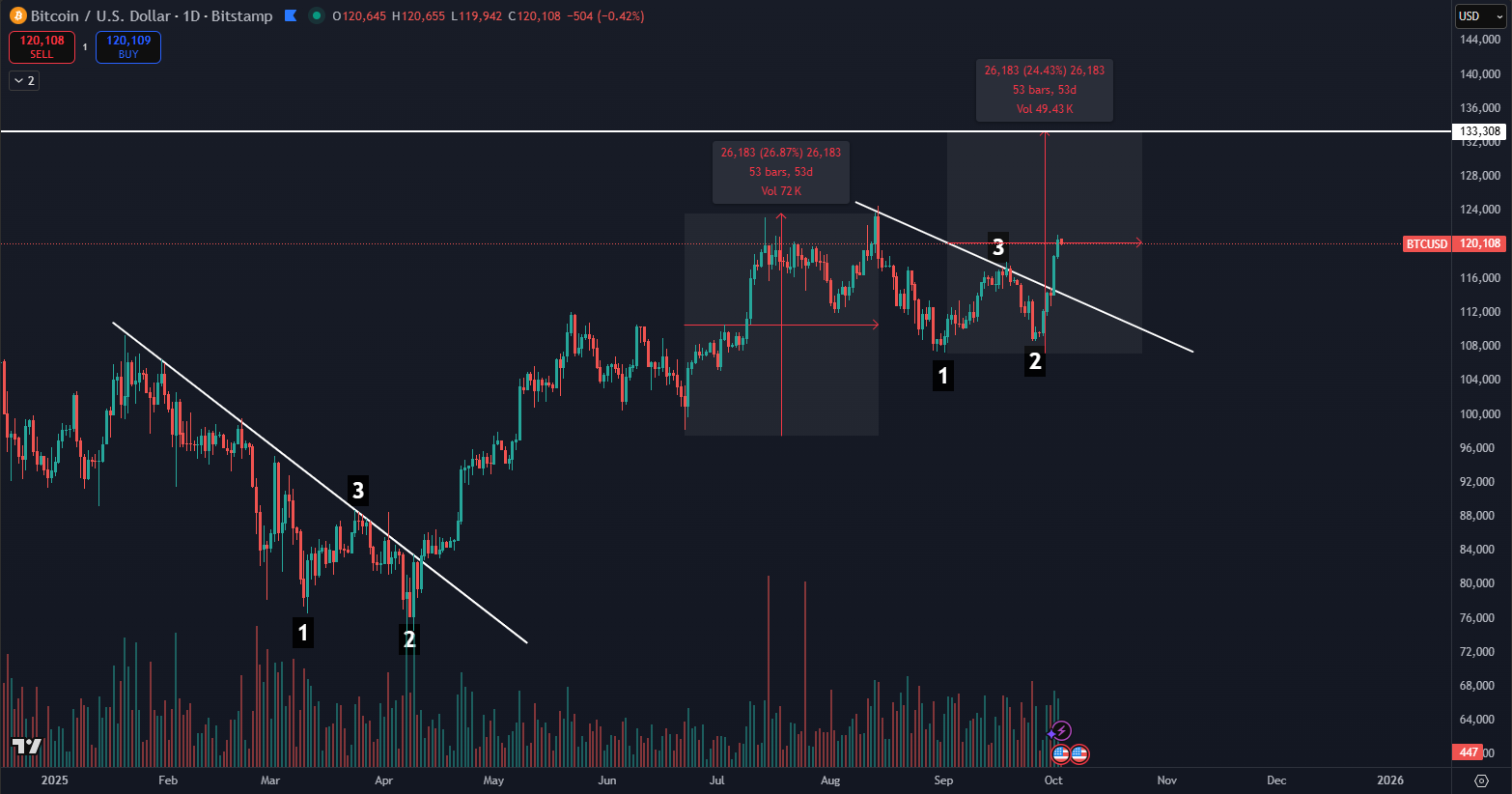 Bitcoin v posledných mesiacoch vykazuje znaky rastúceho dopytu, ktorý sa rozbieha už od júla. Tento trend môže vytvoriť podmienky pre ďalší prudký nárast hodnoty, ktorý by mohol v priebehu záveru roka posunúť cenu až k hranici 200 000 dolárov. Podľa údajov TradingView sa Bitcoin aktuálne obchoduje na cene 120 000 dolárov.