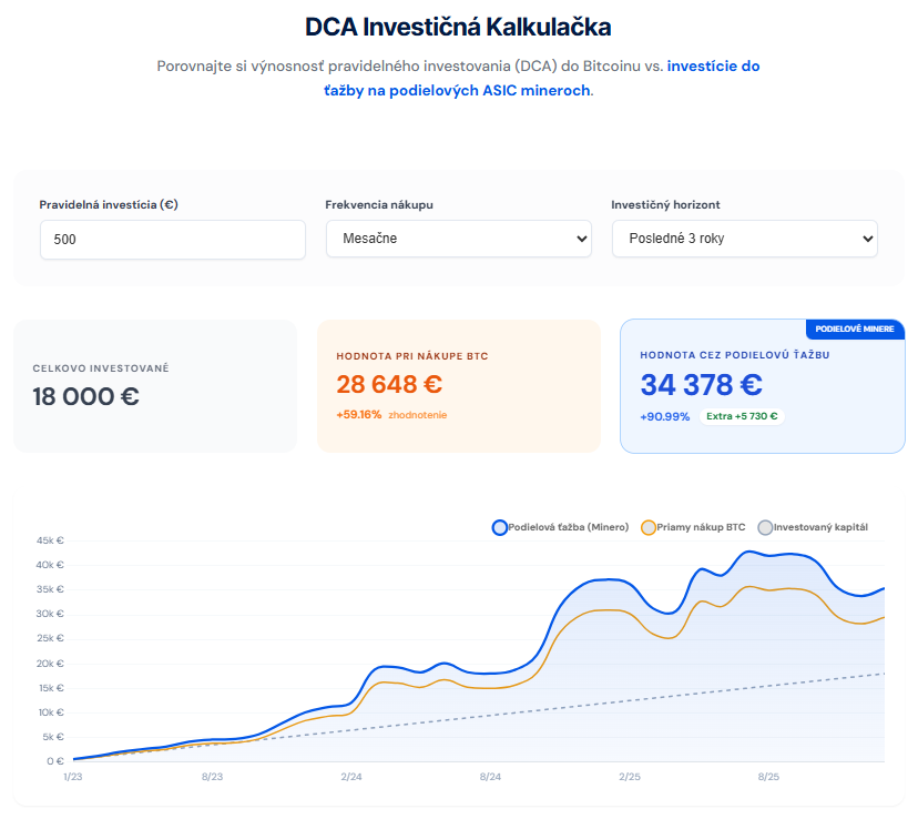 Ak po 10–11 mesiacoch jeden stroj ťaží 200 € mesačne, investor už nemusí posielať pôvodných 500 €, ale napríklad len 300 € z vlastných zdrojov. Zvyšných 200 € pokryje samotná ťažba. Výsledkom je pokračovanie v DCA stratégii s nižším zaťažením cashflow.