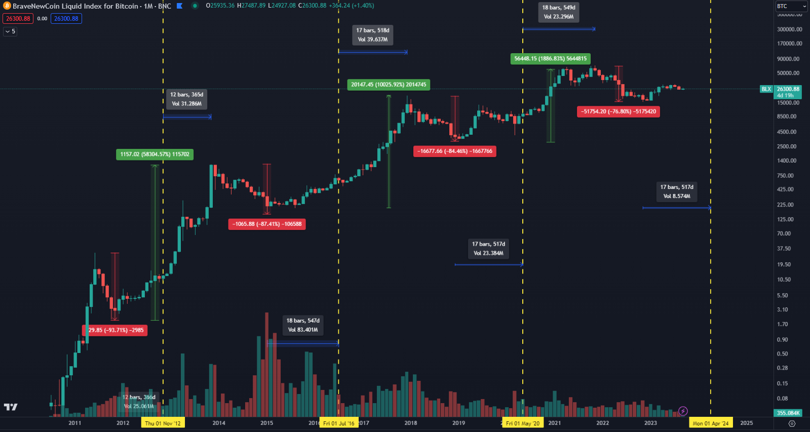Konkrétne v súčasnej fáze trhu sú všetci bitcoinoví fanúšikovia v očakávaní, pretože ďalší halving je naplánovaný podľa Buybitcoinworldwide už na 17. apríla 2024. Investor, ktorý nakupoval bitcoin posledný rok každý deň je približne na tom istom, čo bol pred rokom, keďže cena najprv polroka padala a potom polroka rástla. Tieto nákupy však môže ďalší bullrun výrazne zhodnotiť.