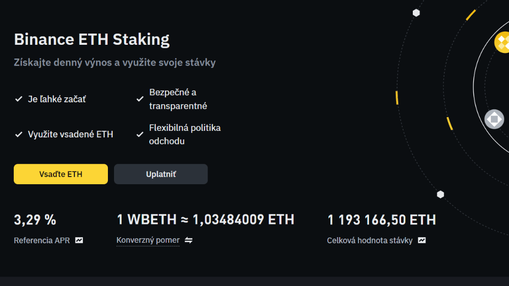 Možnosti stakingu nájdete na stránkach kryptomenových búrz. Niektoré kryptopeňaženky majú tieto funkcie priamo integrované. Ako príklad môžeme uviesť staking na burze Binance. Ponúka viacero možností. Uvedený príklad znázorňuje staking Etherea, za ktoré získate WBETH. Túto kryptomenu stačí následne zameniť priamo za Bitcoin.