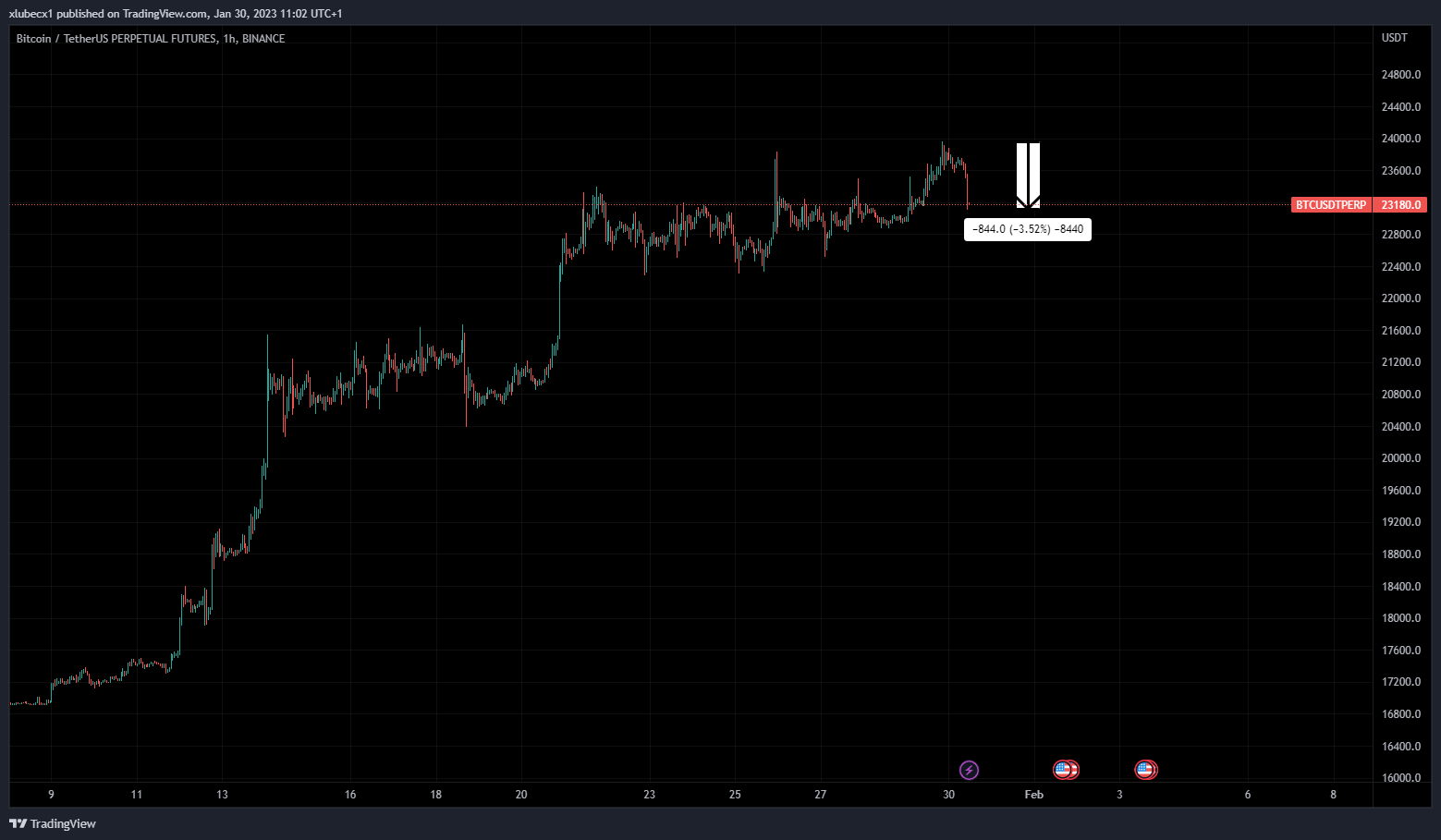 Súčasný rast je dlhodobo neudržateľný a je vysoko pravdepodobné, že čoskoro príde veľký pokles. Inflácia síce postupne po celom svete ustupuje, ale úrokové sadzby FED-u, ECB a ďalších veľkých centrálnych bank sa naďalej zvyšujú. Preto, ako sme upozorňovali už v minulom článku: Bitcoin nám ešte poskytne šancu nakupovať pod 20 000 dolárov – Cesta k miliónu #10, je vysoko pravdepodobné, že bitcoin sa minimálne pod 20 000 dolárov môže dostať. Podobná situácia je u akcií a indexu S&P500.