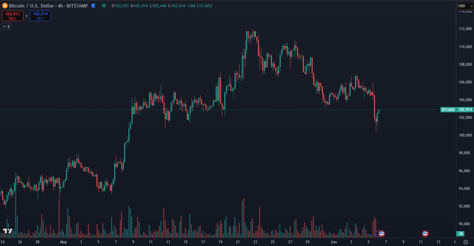 Tieto správy najskôr vyvolali rast Bitcoinu na úroveň 106 850 dolárov, čo signalizovalo pozitívnu reakciu trhu. Avšak podľa údajov TradingView nasledoval okamžitý výpredaj, ktorý spôsobil rýchly pokles ceny až na 100 400 dolárov v priebehu niekoľkých hodín.