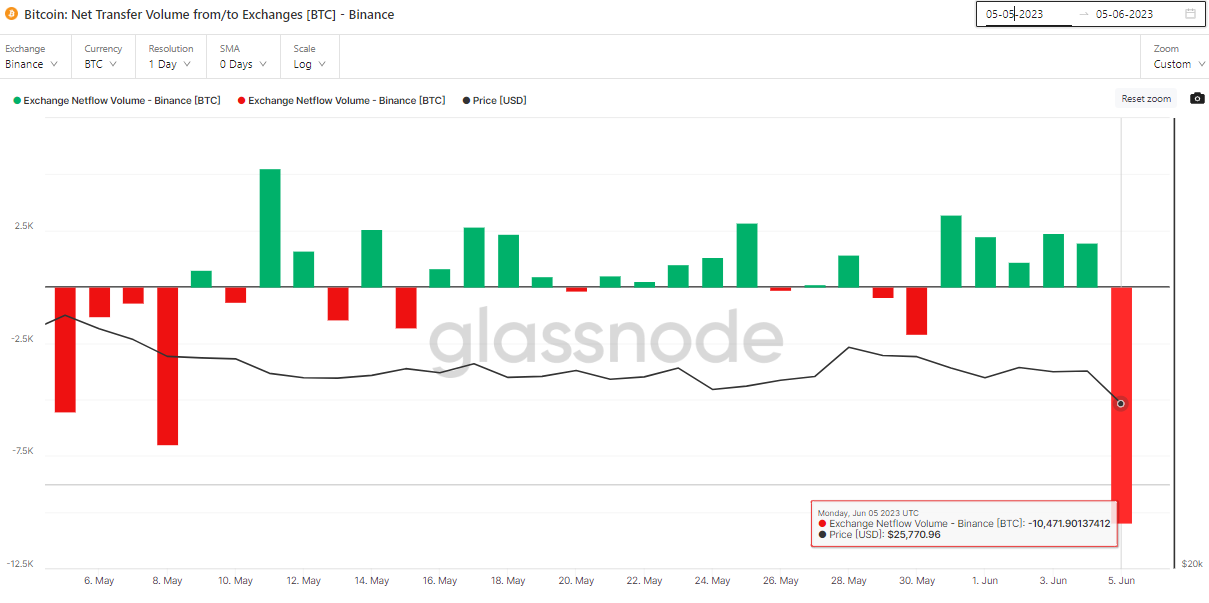 Na základe údajov z analytickej platformy Glassnode môžeme presne identifikovať, koľko bitcoinov odišlo z burzy Binance v priebehu 24 hodín v dôsledku žaloby zo strany SEC-u. Dňa 5. júna opustilo burzu až 10 471 BTC v hodnote 277 miliónov dolárov. Ide zatiaľ o najväčší denný odliv v roku 2023 a zároveň najvyšší od 13. decembra 2022.