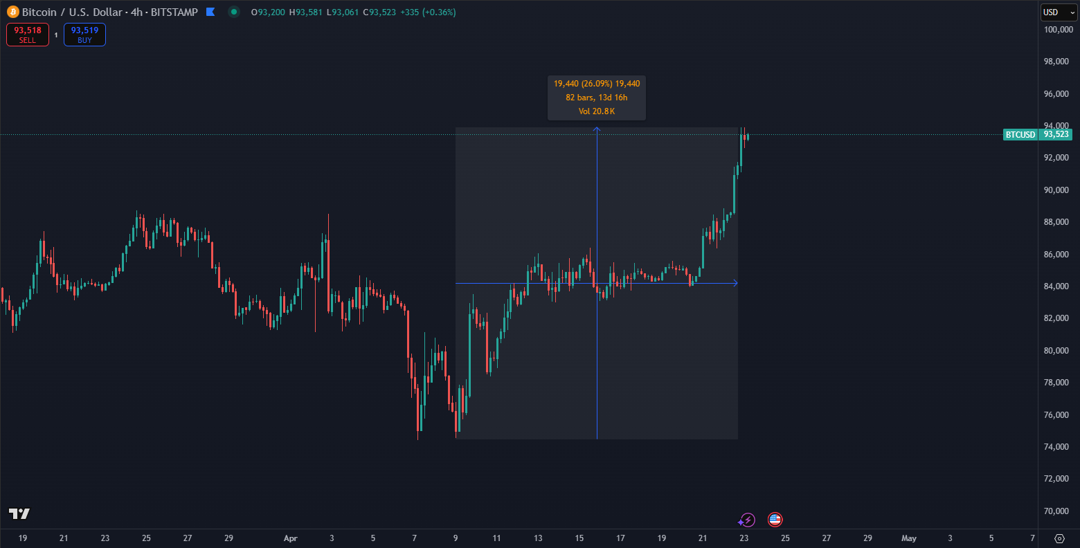 Aktuálne sa Bitcoin obchoduje na úrovni 93 200 dolárov, čo je hodnota, ktorú sme naposledy videli 3. marca 2025. Tento trend potvrdzuje, že kryptomeny našli pevné dno a nastúpili na cestu obnovy.