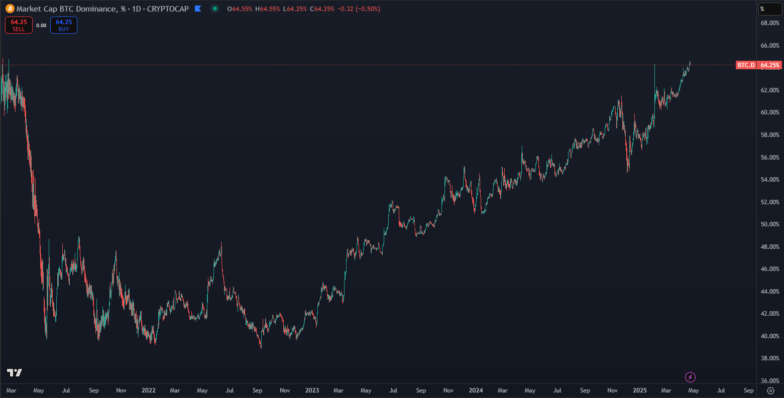 - Dominancia Bitcoinu dosiahla 64,60 %, čo je najvyššie od februára 2021.