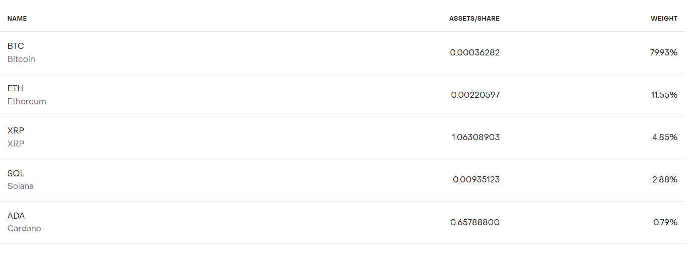 - Kryptomenový fond obsahuje 80 % Bitcoinu a 11 % Etherea, zvyšok tvoria významné altcoiny.