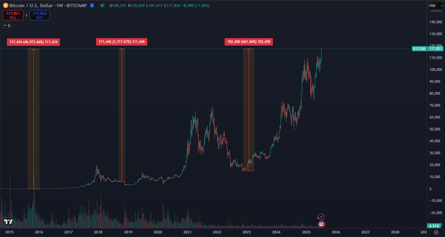 Zhodnotenie Bitcoinu za dlhé roky. Zdroj: tradingview.com