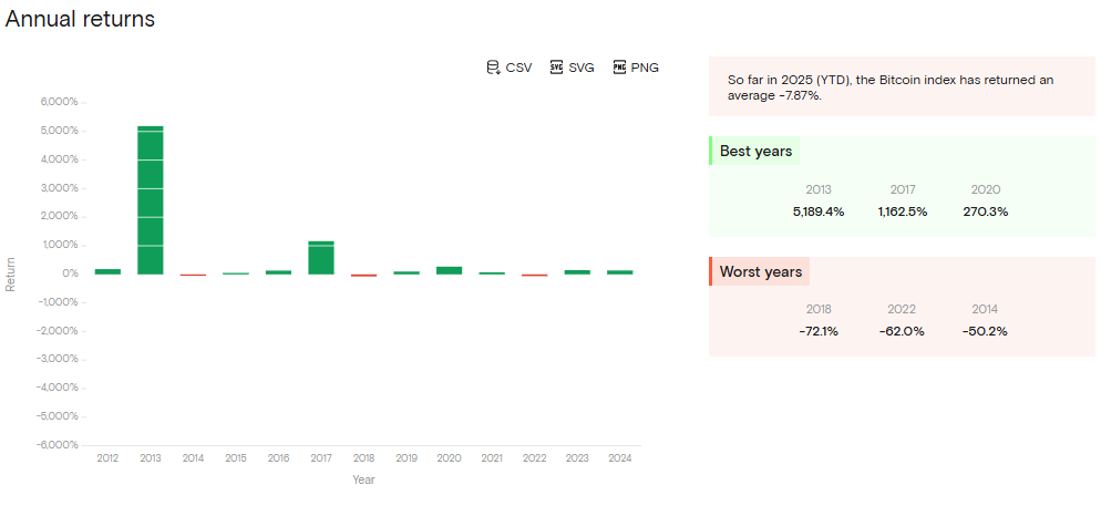 Ako môžeme vidieť, roky 2014, 2018 a 2022 priniesli výrazné straty, zatiaľ čo ostatné roky boli prevažne ziskové – niektoré až extrémne. Z toho vyplýva, že Bitcoin je mimoriadne volatilný a vyžaduje dlhodobý investičný horizont. Pravidelné investovanie môže pomôcť rozložiť riziko a ochrániť pred stratami spôsobenými nesprávnym načasovaním nákupu.