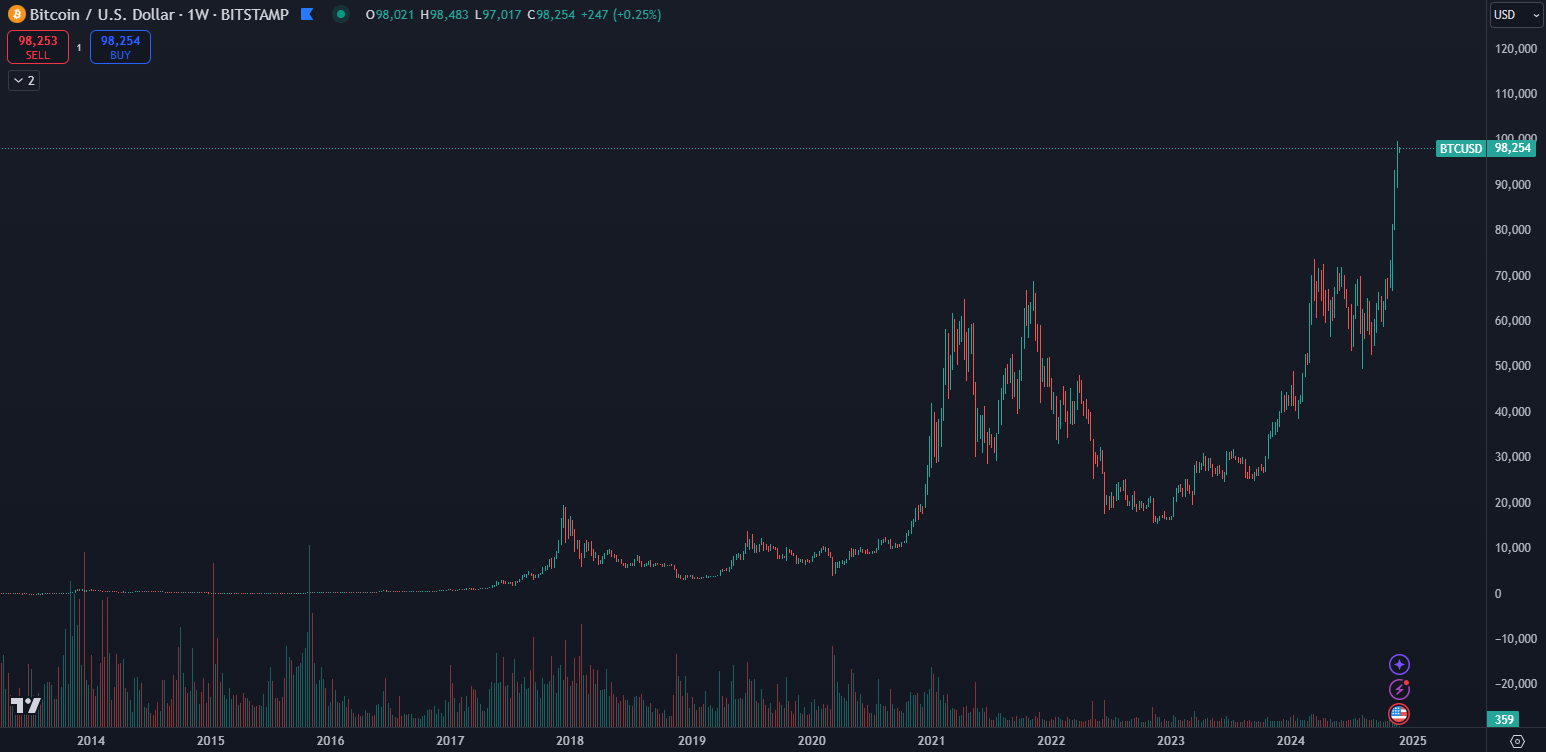 V čase písania sa Bitcoin obchoduje na vrchole blízko 100 000 dolárov, a preto si mnohí myslia, že na kúpu je už neskoro. V skutočnosti to isté si ľudia mysleli, aj keď Bitcoin bol na vrchole pri cene 60 000, 20 000 aj 1 000 dolárov. Pri investovaní platí, že lepšie je zapojiť sa neskôr ako vôbec.