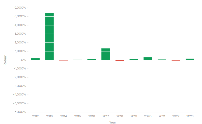 Za posledných 13 rokov mal bitcoinový index v dolároch zložené ročné tempo rastu 99,47 %. Medzi najvýkonnejšie roky zaraďujeme 2013 (+5 428,7 %), 2017 (+1 336,4 %) a 2020 (+304,5 %), ukazujú údaje Curvo. Naopak, najhoršie roky sú 2018 (-73,4 %), 2022 (-64,2 %) a 2014 (-56,1 %).