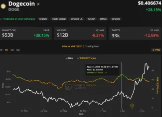 Ako môžeme vidieť na uvedenom grafe skóre pre DOGE začalo naberať veľkú býčiu silu 31.mája a o deň neskôr dosiahlo maximum 74 bodov. Tento bullrun bol zaznamenaný len 14 hodín pred dôležitým oznámením o zaradení Dogecoinu na Coinbase Pro. Po tejto správe nasledoval 45% nárast ceny.