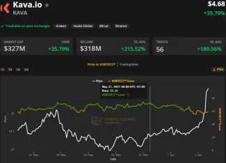 Aj v prípade tohto DeFi tokenu sú už dlhšiu dobu zaznamenané priaznivé podmienky na trhu čo dokazuje aj skóre VORTECS™. 31. mája bola dosiahnutá hodnota 75 bodov, následne o 48 hodín dosiahol token KAVA nárast o 45%.