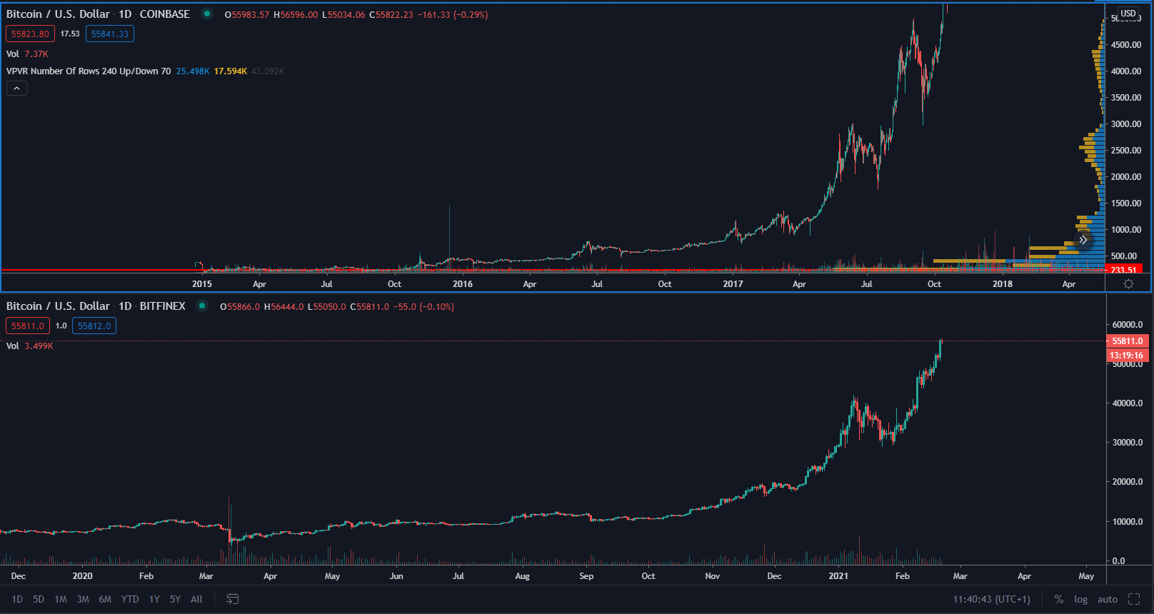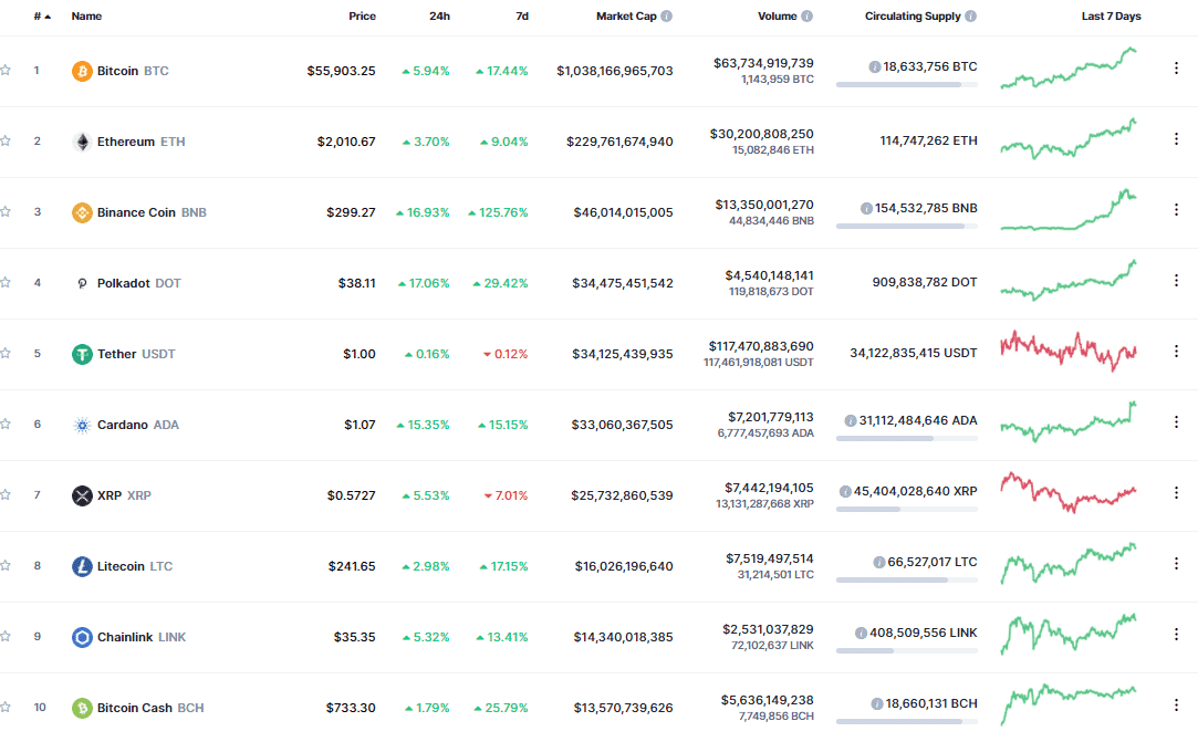 BTC dosiahol nové historické maximum na hodnote 56,600$ a mnoho altcoinov za posledných 24 hodín dosahuje obrovské zisky. V akej situácii sa nachádza trh a čo očakávať najbližšie dni?