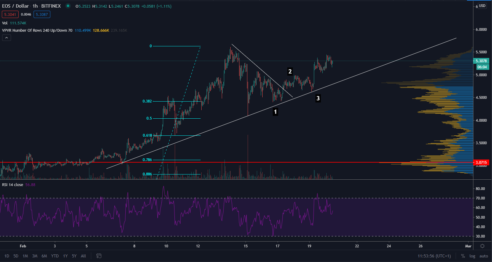 V akej sme však v súčasnosti situácii? Pre lepšie pochopenie som vybral graf EOS. Drtivá väčšina altcoinov, ktoré stoja za zmienkusa totižto nachádzajú v situácii kedy prerážajú rezistencie krátkodobej korekcie a udržujú podporu.