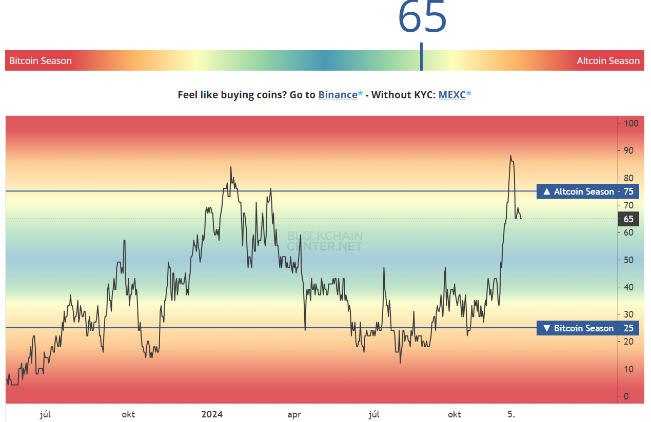 - Index altcoinovej sezóny dosiahol 65 bodov.