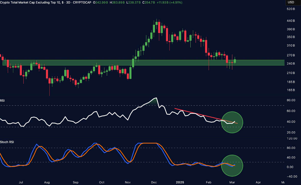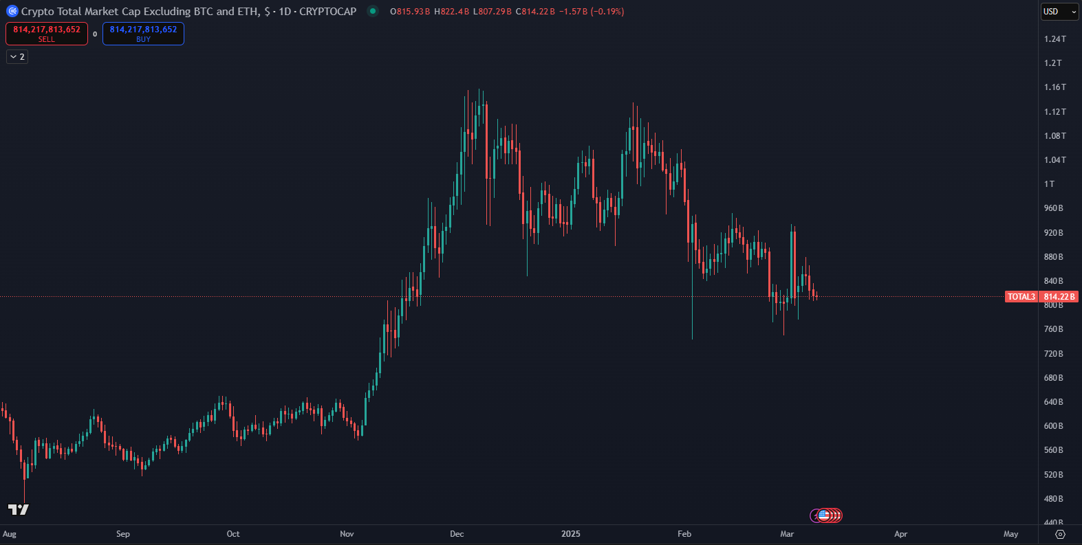 TOTAL3 sleduje trhovú kapitalizáciu kryptomien s výnimkou Bitcoinu a Etherea a slúži ako kľúčový indikátor na meranie záujmu o trh altcoinov.
