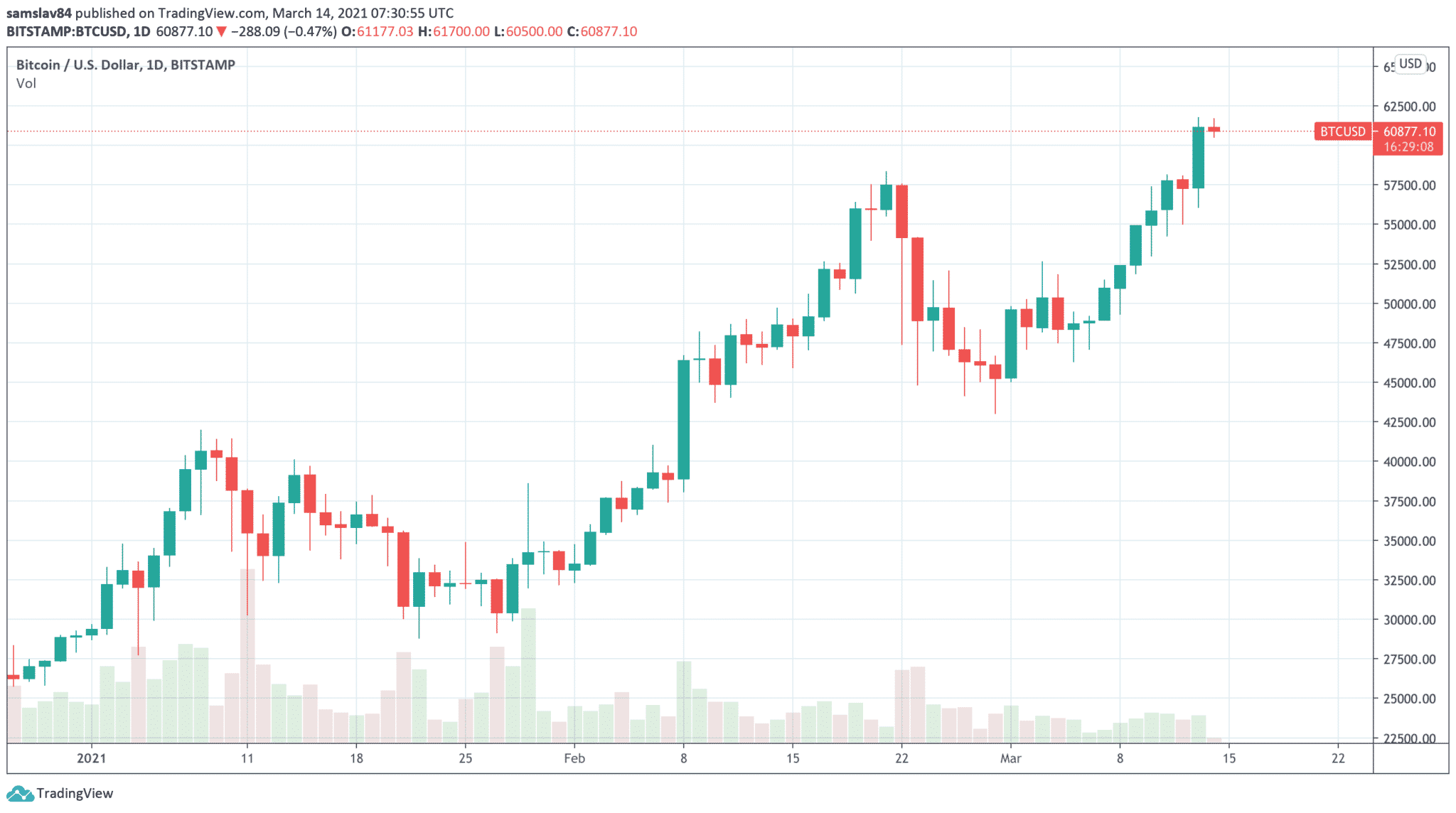 Určite nie je náhoda, že Bitcoin zareagoval na správy o ďalšom znehodnocovaní amerického dolára rastom na nové historické maximum. Včera prvýkrát v histórii prekonal 60 000 dolárov. Aktuálne ATH na burze Bitstamp sa nachádza na cene 61 700 dolárov.