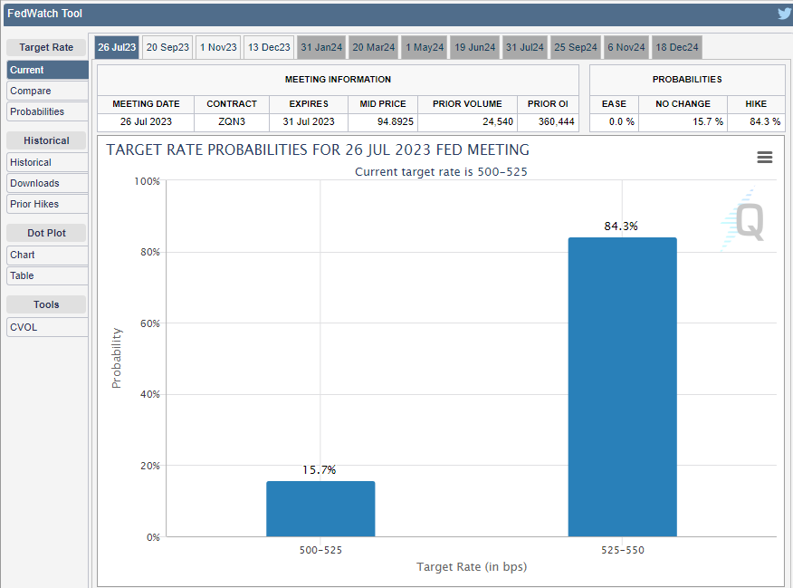 Na základe nástroja CME Fedwatch existuje až 84,3 % šanca, že FED zvýši referenčnú sadzbu o 25 bázických bodov na 5,25 až 5,50 %. Podľa harmonogramu centrálnej banky sa ďalšie stretnutie FOMC uskutoční už 25. a 26. júla. Celkovo sa budú konať ešte 4 stretnutia FOMC v roku 2023.