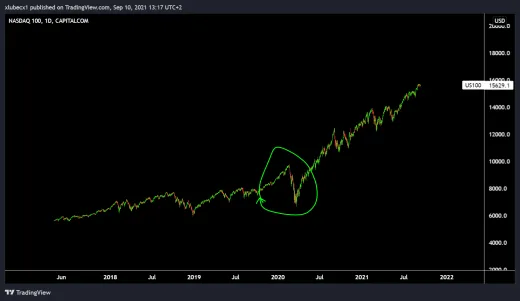Táto kríza je ale iná. Oživenie ekonomiky sme videli na trhoch už po 3 mesiacoch od začiatku veľkého poklesu. Dokonca jeden z najznámejších ukazovateľov sily trhu index Nasdaq 100 sa po 4 mesiacoch vrátil na historické maximum a odvtedy urobil ďalších 100 %.