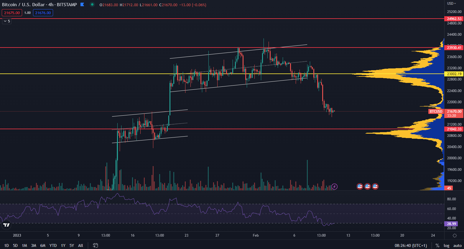 Bitcoin približne dva týždne vytváral bočný pohyb okolo hladiny 23 000 dolárov a napokon vypadol zo štruktúry smerom nadol. Krátkodobí držitelia bitcoinu to už nevydržali a začali realizovať ich zisky.