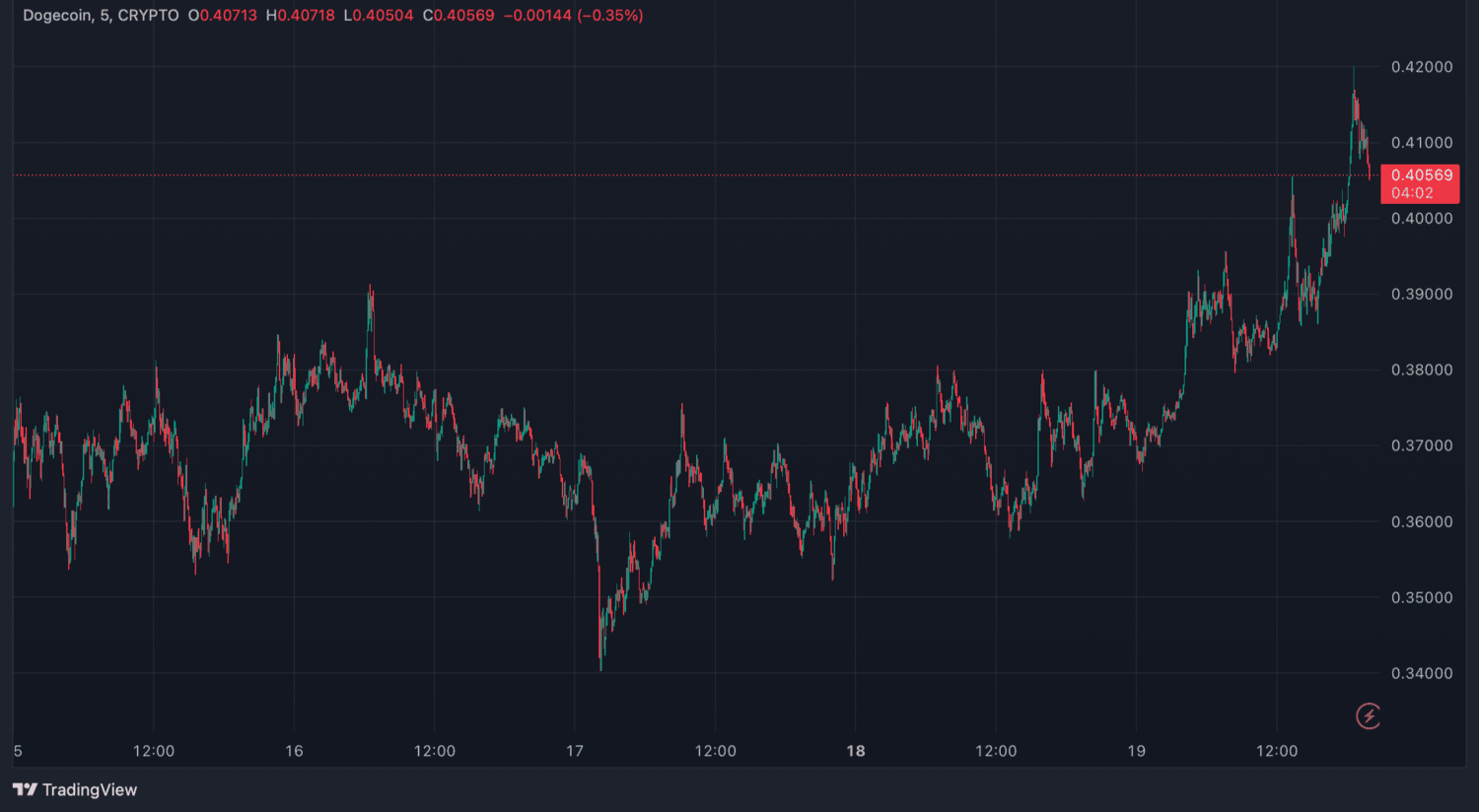 Dogecoin zaznamenal nedávno významný cenový pohyb. Za posledný týždeň jeho cena vzrástla o 33,98 %. Za posledný mesiac vyskočila o 170,98 %. Za posledných 6 mesiacov vzrástla o 118,53 %. Tieto čísla ukazujú, že Dogecoin získava na kryptotrhu momentum.