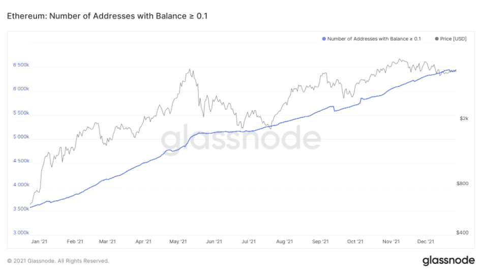 Počet peňaženiek s minimálne 0,1 ETH. Zdroj: Glassnode