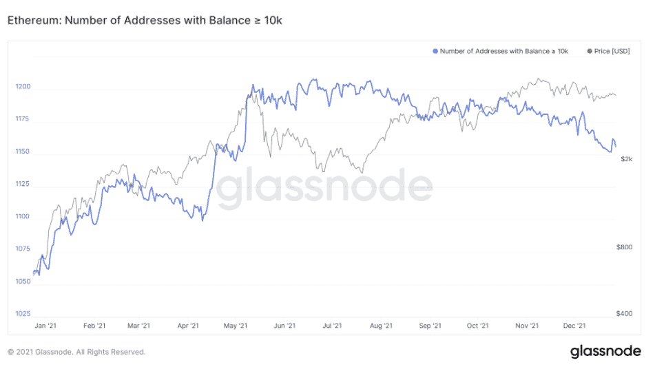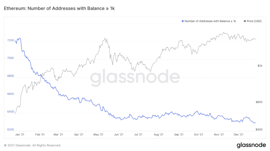 Blockchainová dátová analytická služba Glassnode odhalila, že počet adries obsahujúcich aspoň 1 000 ETH tento pondelok klesol na 6 292. To je najnižšia hodnota od apríla 2017. Na vrchole od začiatku roka to bolo 7 239 v januári.