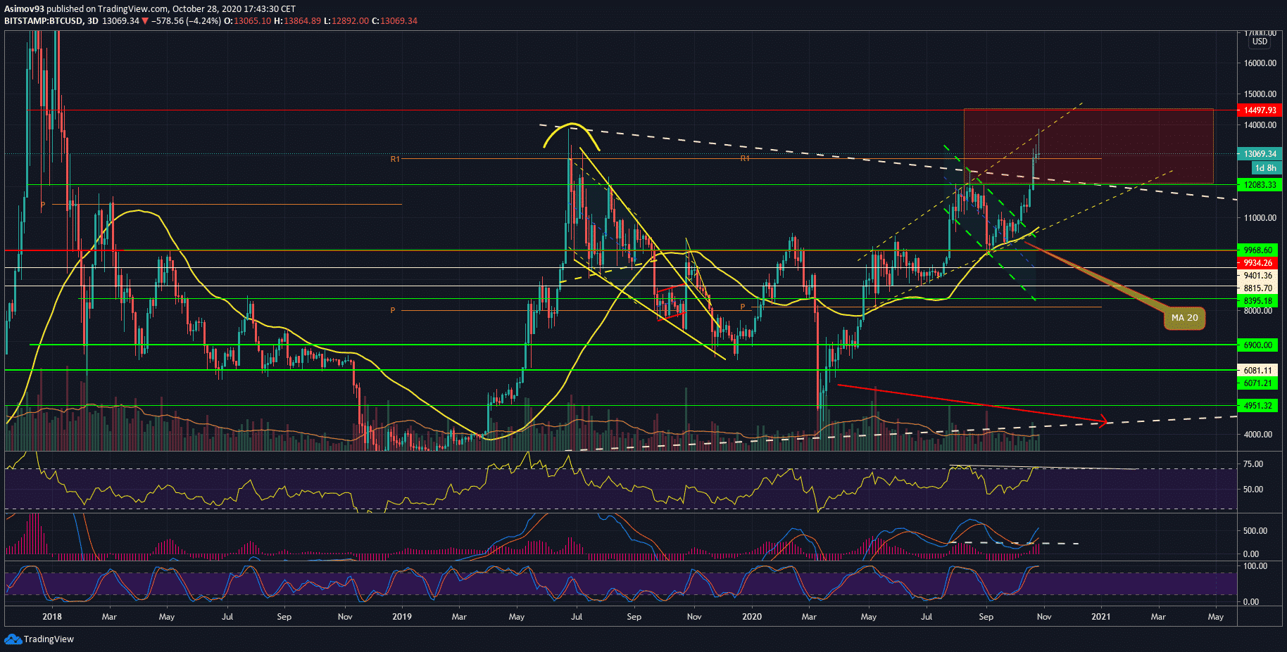 Bitcoin po otestovaní tejto úrovne v priebehu niekoľkých hodín padol o 1000 $ a zastavil sa až na 12 900 $ čo naznačuje, že nebude tak ľahké preraziť toto high. V najbližších dňoch trh bude hľadať dno. Viac sa na aktuálnu situáciu na trhu pozrieme už o pár minút na našom streame (pripnutý je hore) a mrkneme aj na altcoiny či akciové trhy.