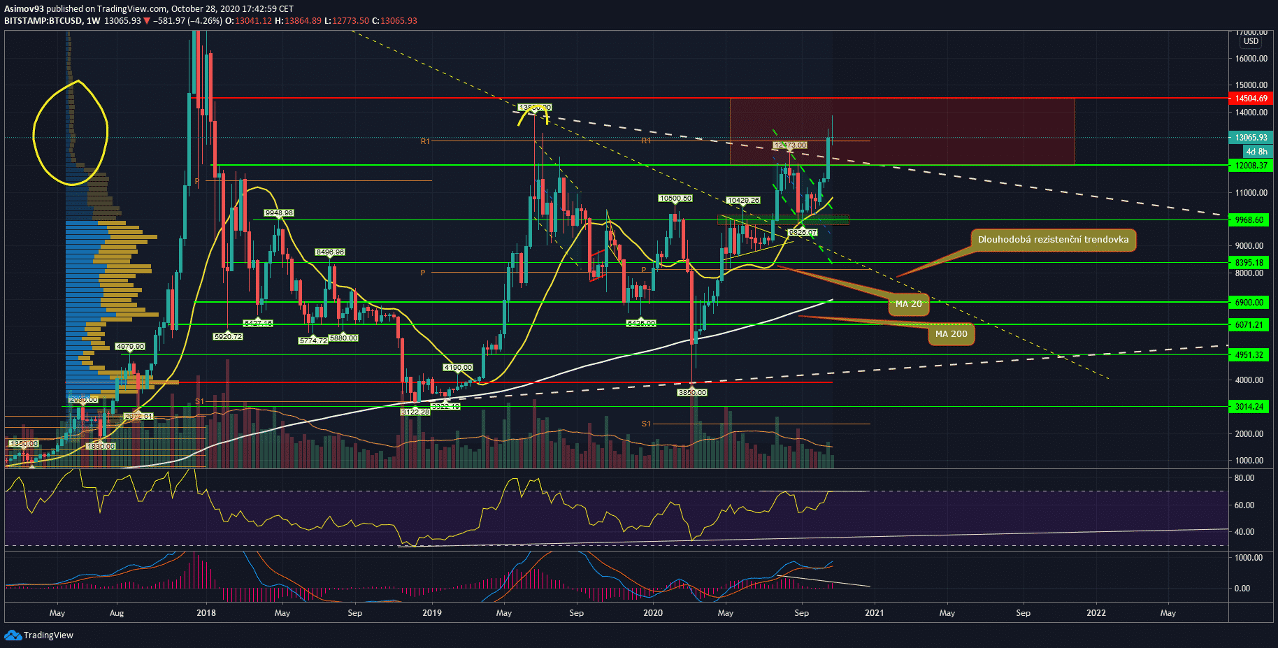 Ako som písal vo svojej včerajšej analýze na Bitcoin (BTC), trh zatvoril za minulý týždeň veľmi bullish sviečku, ktorej sa podarilo z polovice preraziť rezistenčné pásmo. Ja osobne považujem za rezistenciu celý interval 12 000 USD – 14 500 USD. A vzhľadom k dnešnému price action sa zdá, že o moc vyššie už nepôjde.