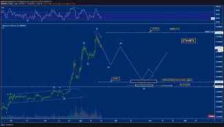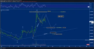 Na altcoine ETH sledujem možné dokončenie celého bullish cyklu. Je na mieste očakávať korekčný ABC pohyb s dokončením na golden ratio hladine, teda na 0,027 BTC. Avšak všetky kryptomeny sú pomerne silne bullish, preto v prípade break out pohybu aktuálneho high na grafe by bola analýza neplatná a tým pádom rušíme order. V korekcii sa všeobecne neobchoduje, len čakáme na vyplnenie orderu.