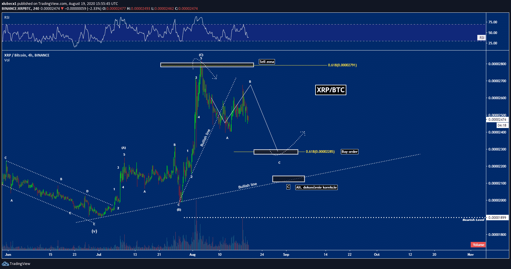 XRP už časť z korekcie má za sebou a chýba dokončenie poslednej vlny C. Rovnako ako v prípade ETH zatiaľ iba čakám na vyplnenie orderu, ktorý mam na golden ration hladine. Ako možnú alternatívnu zónu na nákup sledujem 2 100 satoshi, kde je okrem silného supportu aj kľúčová bullish line, ktorá drží tento altcoin v bullish trende.
