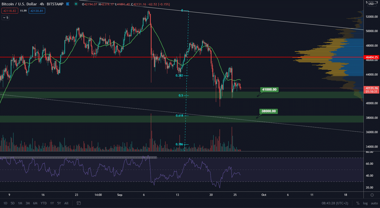 Bitcoin vytvoril krátkodobé maximum na hladine 43 250 $, čo spôsobilo otestovanie MA21 na perióde 4H ako rezistencie. Následne cena vstúpila do mierneho poklesu. Z krátkodobého hľadiska tak cena môže ísť do sideway štruktúry podobne ako medzi 7. a 13. septembrom. Supportná hladina sa nachádza na hodnote 41 000 $ a 38 000 $.