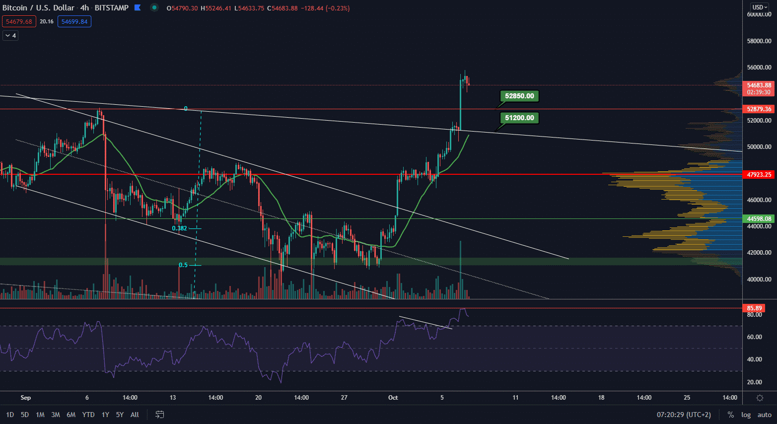 Bitcoin pri prerazení maxima konečne dosiahol zvýšenie objemov. Tento rast potvrdzuje, že útok na nové ATH sa blíži, pretože cena prekonala predošlé dlhodobé maximum na 53 000 $. Prvýkrát od ATH tak dlhodobé maximá rastú. Z krátkodobého hľadiska to však vyzerá, že cena potrebuje vychladnúť a ísť do krátkodobej korekcie.