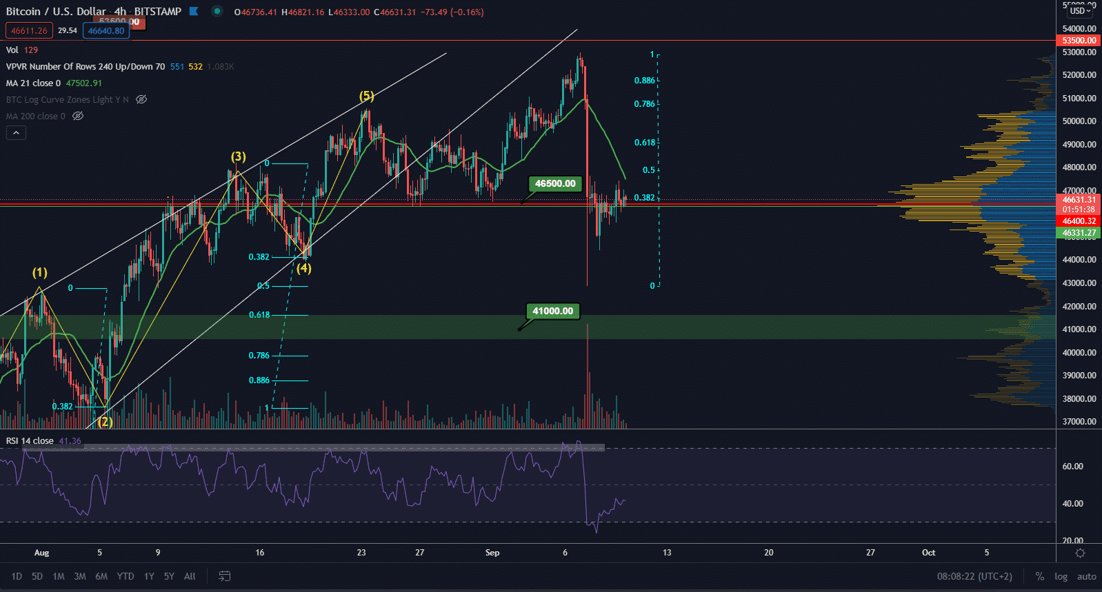 V prípade, že by cena neudržala túto supportnú zónu, je možné, že na rast si počkáme omnoho dlhšie. Z krátkodobého hľadiska je rezistencia na hladine 47 500 $, kde sa nachádza MA21 na 4-hodinovom grafe. Ak ju prekonáme, môžeme ísť do rastúceho legu. Ukončenie korekcie však stále nie je potvrdené.
