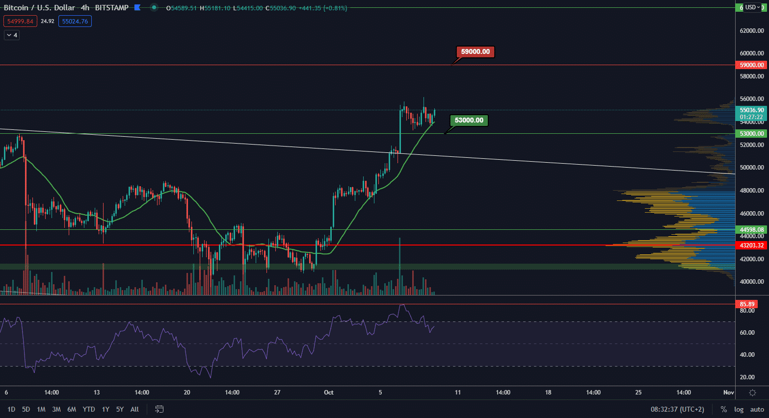 Ďalším targetom, ktorý budeme sledovať, je hladina 59 000 $. Ide o druhé najvyššie dlhodobé maximum po ATH. Hladina ATH je skôr psychologická hranica ako rezistencia. V hre je samozrejme aj scenár, že cena dosiahne nové ATH skôr ako vznikne korekcia, avšak treba si uvedomiť, že čím dlhšie pôjde cena bez korekcie nahor, tým silnejšia potom korekcia bude.