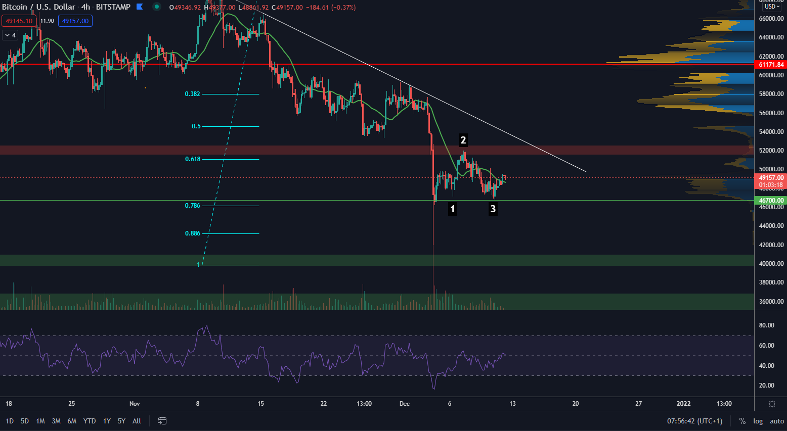 Bitcoin formuje potenciálne 123 bottom formation, no cena na jeho potvrdenie potrebuje prekonať bod 2 na hladine 52 000 $. Zatiaľ sa cena nachádza medzi bodom 2 a 3 a teda nevieme, či tento pattern bude nakoniec platný. Podobnú situáciu sme mali 19. – 23. novembra, kedy pattern nakoniec zlyhal.