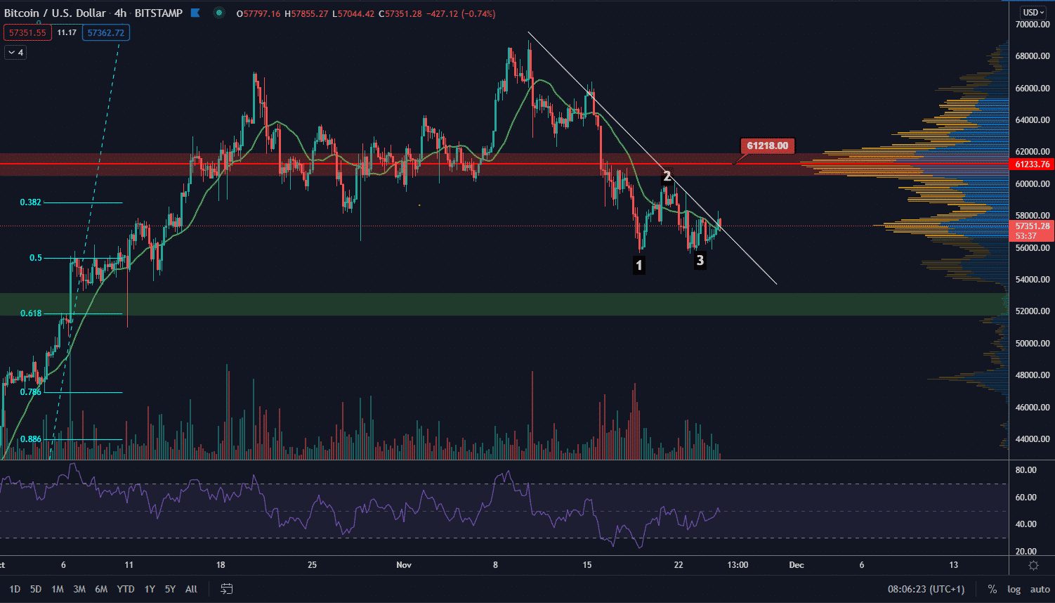 Tým, že cena nedokázala prekonať bod 2, vznikla sideway štruktúra, ktorá obsahuje rovnaké minimá a klesajúce maximá. Z krátkodobého hľadiska cena smeruje nadol. Najdôležitejšie však je udržať dvojité dno na hladine 55 650 $. Ak by totižto cena neudržala toto dvojité dno, korekcia by pokračovala.