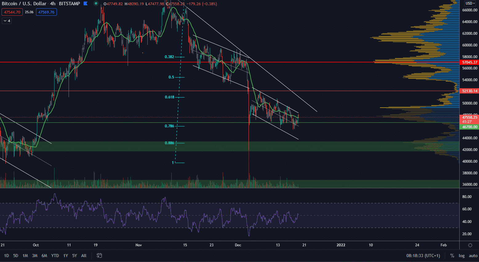 Posledné dve minimá sa sformovali na rovnakej úrovni, no stále sa cene nepodarilo prekonať posledné maximum medzi nimi na hladine 49 250 $. Ak by cena prekonala túto hladinu, pravdepodobne by išla aj nad rezistenciu z maxím korekcie, ktorá je aktuálna od počiatku poklesu od ATH.