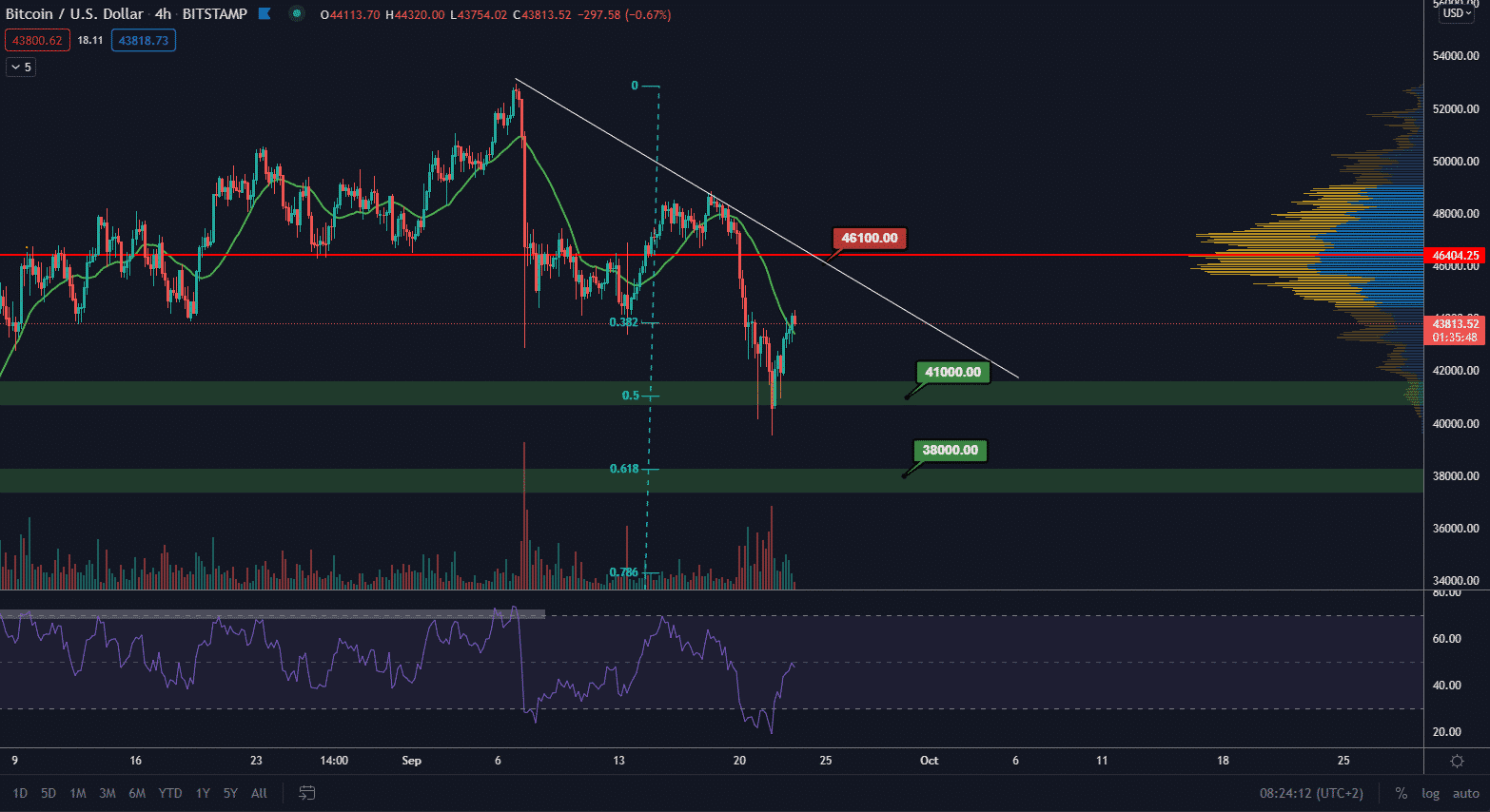 To, čo predovšetkým potrebujeme, sú vyššie lokálne minimá a zastavenie volatility. V tomto momente nenastal signál na takýto zvrat. Súčasná korekcia je však úplne bežná a nachádza sa na 50 % retracementu z predošlého rastu. Ďalší support je cca na 38 000 $ na retracemente 61,8 %. Po akumulácii na jednej z týchto supportných úrovní sa pravdepodobne cena obráti smerom hore.