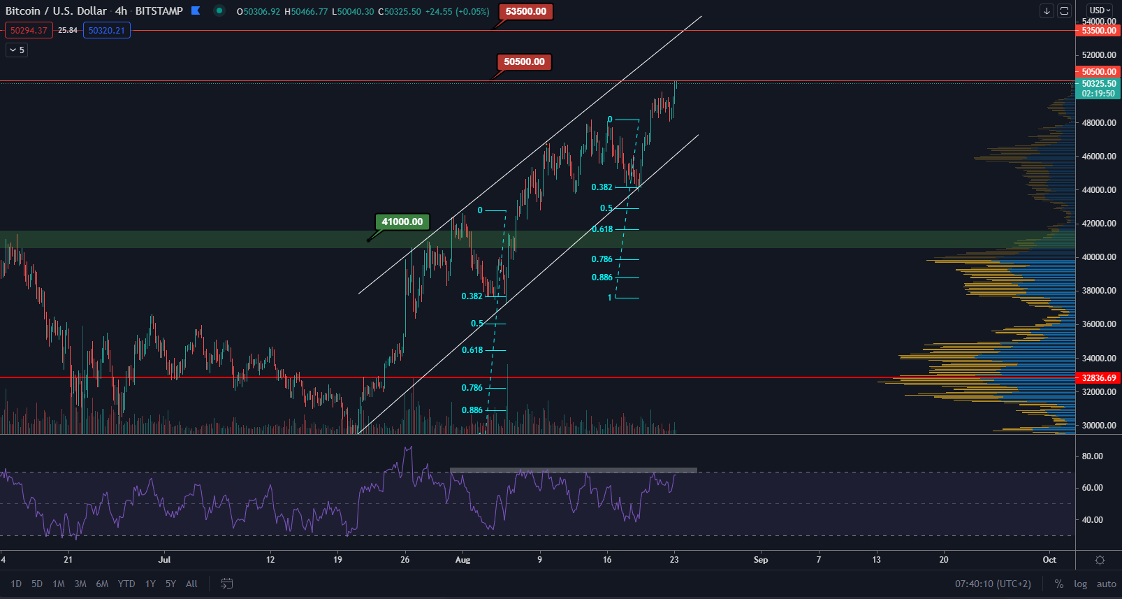 BTC pokračuje v rastúcom legu a nadväzujeme tak na včerajšiu analýzu. Prvý target na hladine 50 500 $ bol dosiahnutý a teraz budeme sledovať, či sa Bitcoinu podarí dosiahnuť aj ten druhý. Kde sa však tento druhý target nachádza?