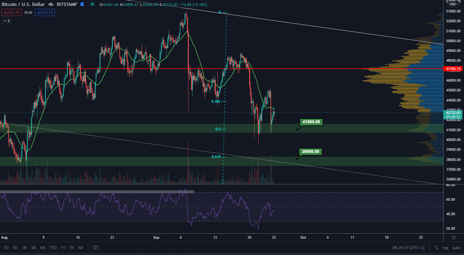 Čo však, ak cena nevytvorí vyššie maximum ako posledné na hladine 45 150 $? V súčasnosti síce nastalo oživenie býčích objemov, no stále prevládajú medvedie objemy. Minimálne však môžeme hovoriť o spomalení korekčnej štruktúry. Jej koniec sa blíži, no momentálne nevieme, či cena už vytvorila dno alebo pôjde na novú supportnú úroveň. Ďalší support sa nachádza na zóne cca 38 000 $.