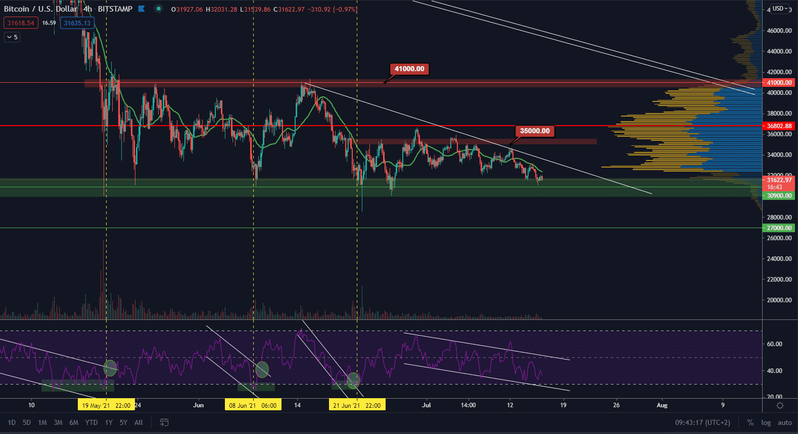 Bitcoin pokračuje aj naďalej v sideway štruktúre, ktorá je aktuálna od posledného májového týždňa. Trhová cena však čoraz viac testuje supportnú hladinu tejto sideway štruktúry, ktorá sa nachádza na hladine okolo 31 000$.