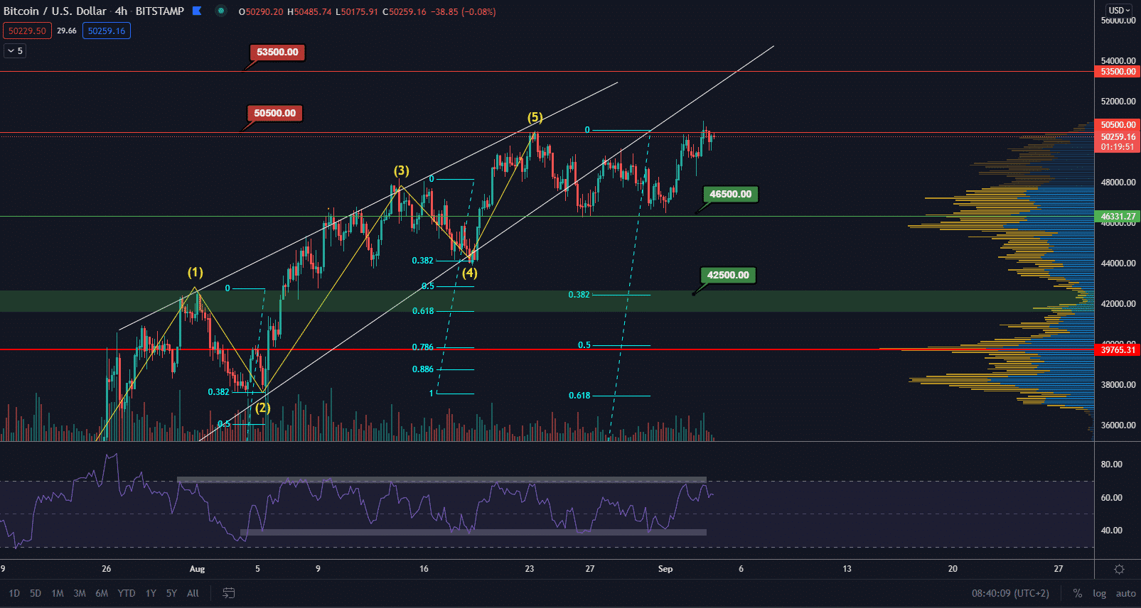 Bitcoin sa nachádza v čase písania článku na hranici rezistencie 50 500 $. Práve na tejto hodnote bol rastúci trend v kline ukončený v bode 5. Po uzatvorení klinu však nedošlo ku korekcii s prvým targetom na 38,2 % retracementu 42 500 $, ale naopak, sme sideway. Jasne to poukazuje na silu býčích rúk.